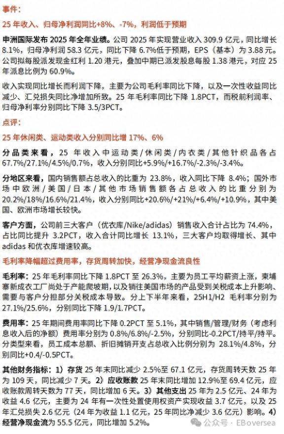 筹商到国表里宏不雅经济和零卖环境仍存不细目性,光大证券下调公司26~27年盈利预测(归母净利润较上次预测分裂下调16%/14%),新增28年盈利预测,预测公司26~28年归母净利润为60/67.8/74亿元,对应26~28年EPS分裂为3.99/4.51/4.92元,PE分裂为11/9/9倍,估值较低、看护申洲国际“买入”评级。
