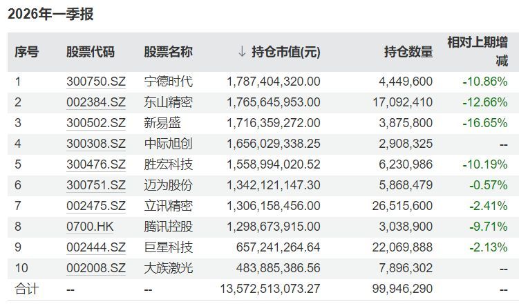 当天云开体育,睿远基金旗下居品泄露了2026年一季报,记者凝视到,傅鹏博措置的睿远成长价值,在一季度减握了新易盛、东山精密、胜宏科技等多只CPO板块个股,不外中际旭创投入前十大,握仓大标的依然围绕PCB、芯片和光通讯。
